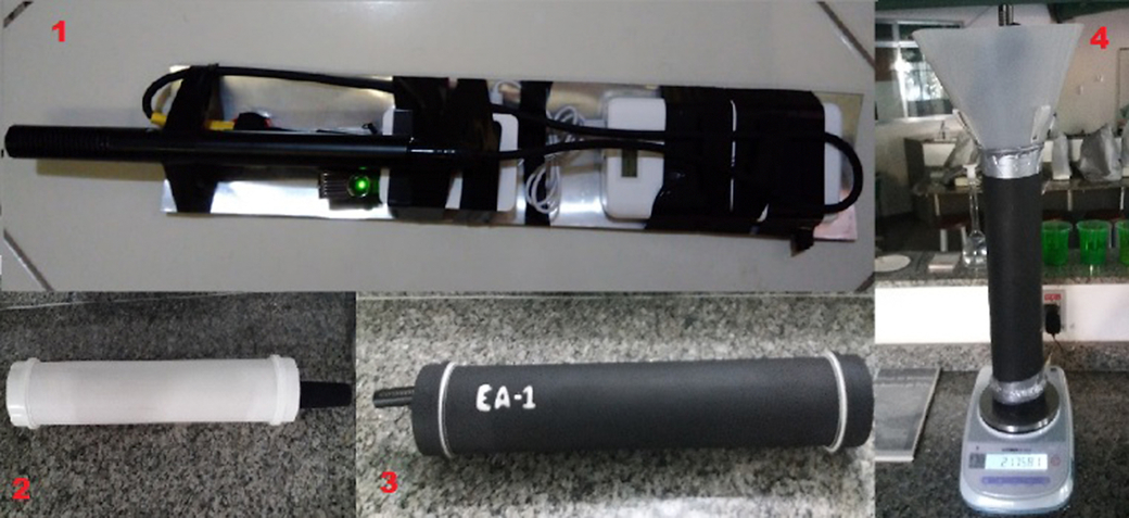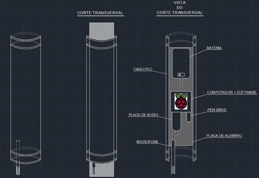 O sistema foi acoplado a uma placa de alumínio para melhor dissipação do calor, caso houvesse superaquecimento do sistema, e inserido num cano PVC de 100 mm. Como forma de proteção contra a chuva, um colar elisabetano também foi adaptado em uma das extremidades para proteção do microfone, resultando num equipamento de aproximadamente 2,200 kg e 60 cm, batizado de Estetoscópio Ambiental 1 (EA-1) que pode ser observado no item 4 da Figura 7, onde aparece o equipamento finalizado.