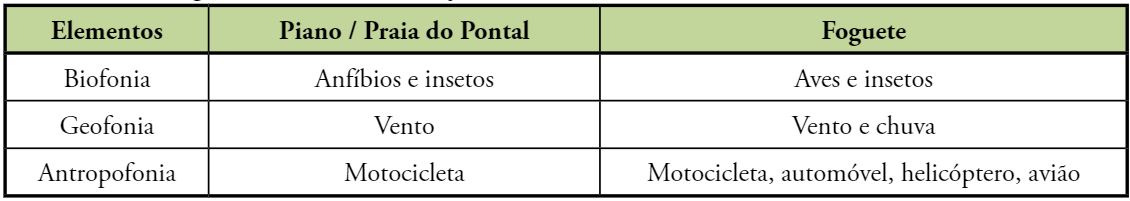Na Restinga do Piano houve predominância de anfíbios e insetos em sua biofonia, devido a sua proximidade a um significativo corpo hídrico. Na Restinga do Foguete, os dados demonstraram a predominância de aves e insetos em sua biofonia. Esse local está próximo a um pequeno corpo hídrico com pouco volume de água, o que provavelmente não atrai a mesma abundância de anfíbios quanto o local da Restinga do Piano. Também se observou na Restinga do Foguete a presença frequente de antropofonia, como aeronaves e veículos automotores, devido à proximidade com o Aeroporto de Cabo Frio e com a Rodovia Estadual (RJ-140).