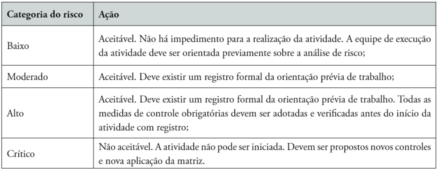 Diante das possibilidades de categorias de risco, conforme julgamento proposto, exemplificado no Quadro 6, a matriz indica aos avaliadores a permissão ou não da execução da atividade e a adoção de práticas de organização sobre as ações e documentos a serem implementados no controle de risco (Quadro 7).