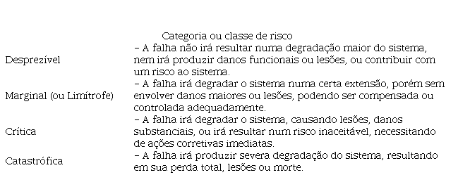 No Quadro 1, a categoria pode variar de Desprezível até Catastrófica, característica que se altera devido ao impacto do risco no processo, sem relacionar a probabilidade do evento ocorrer ou a frequência da atividade.