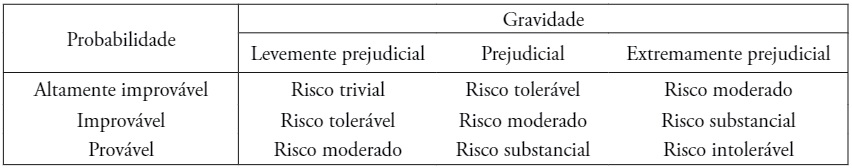 A matriz do Quadro 2, sugerida na norma BS 8800, faz uma relação da probabilidade da ocorrência e sua consequência, e apresenta-se como risco trivial, quando a probabilidade de ocorrer o evento é improvável e a consequência é levemente prejudicial, enquanto o risco intolerável é a junção de uma ocorrência provável com uma consequência extremamente prejudicial (CICCO, 1996).