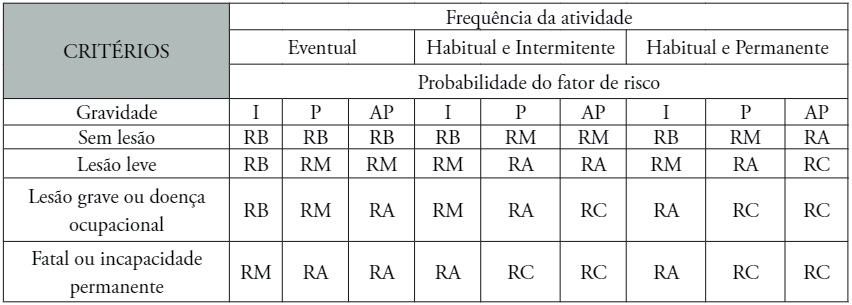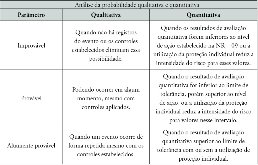 A nomenclatura do parâmetro probabilidade de ocorrência do evento, que nesse caso é o acidente de trabalho e a doença ocupacional, foi adaptada de Manuele (2008), e a análise ajustada à realidade brasileira, conforme preconiza a NR-09 Programa de Prevenção de Riscos Ambientais – PPRA, estabelecida com a análise do EPI.