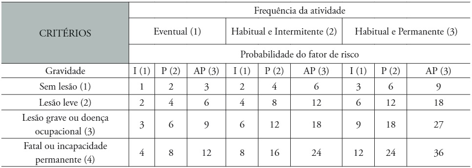 Para estabelecer a relação dos três parâmetros, foram estabelecidos valores para frequência de 1 a 3, probabilidade de 1 a 3, e gravidade, que varia de 1 a 4.