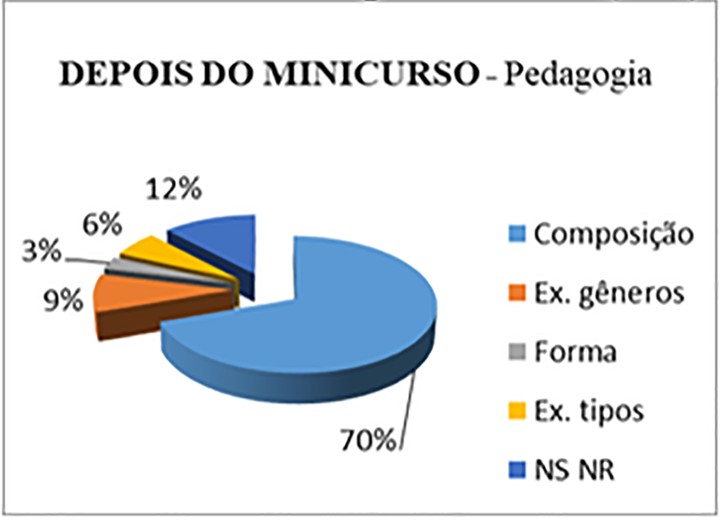 Percebeu-se que nas turmas de Pedagogia houve um melhor desempenho quando solicitados a exemplificar os tipos textuais. A exemplificação de tipos subiu de 38% antes do minicurso, para 82% depois do minicurso.