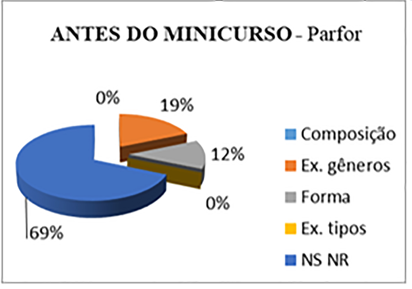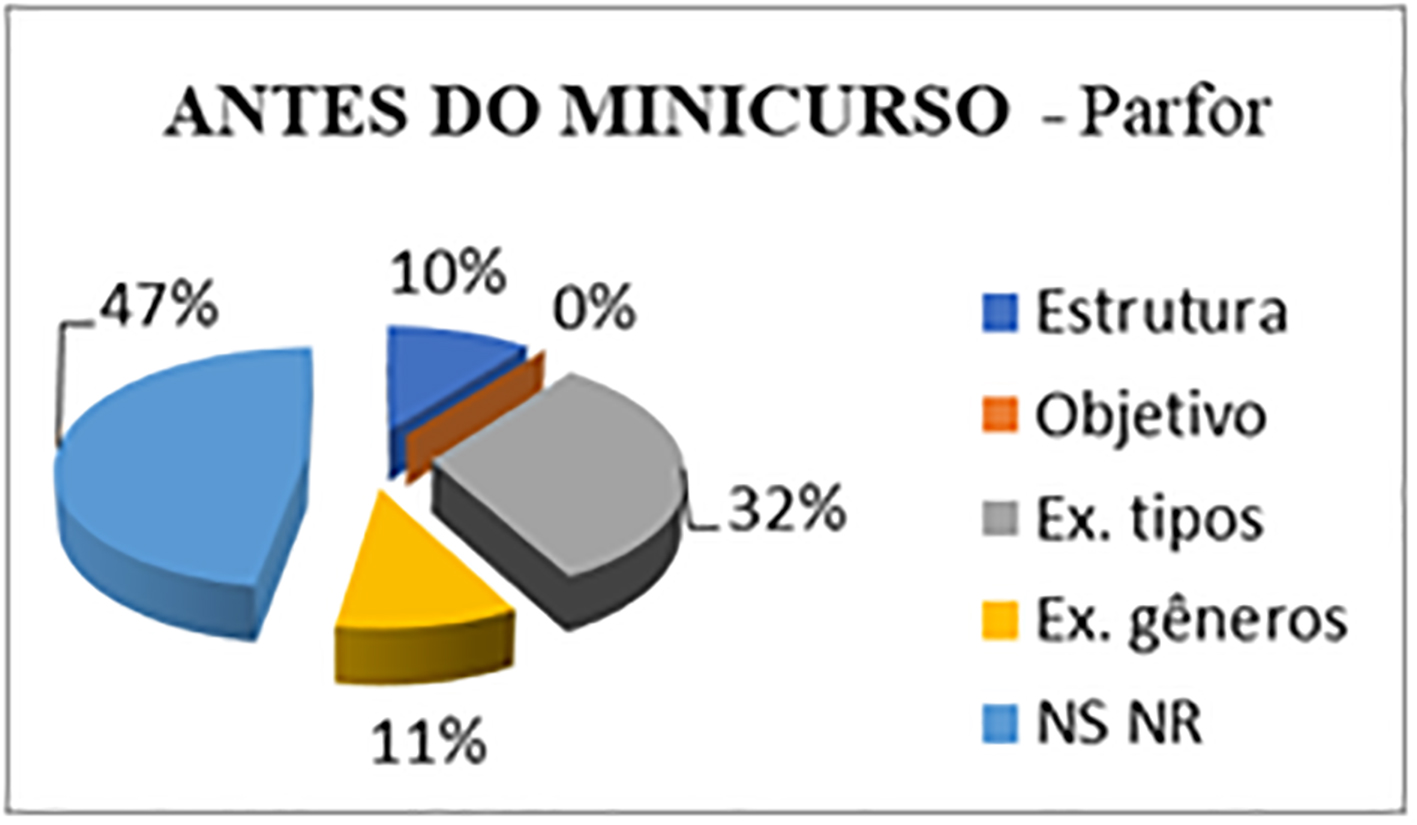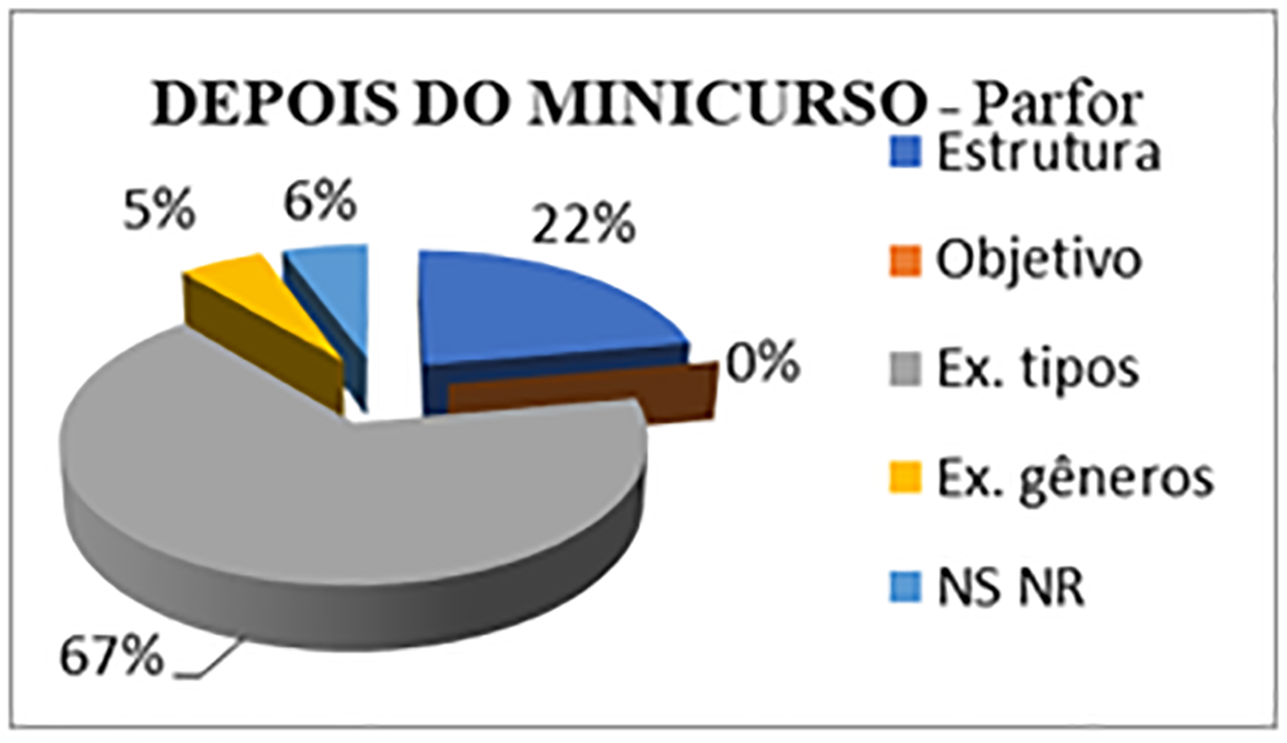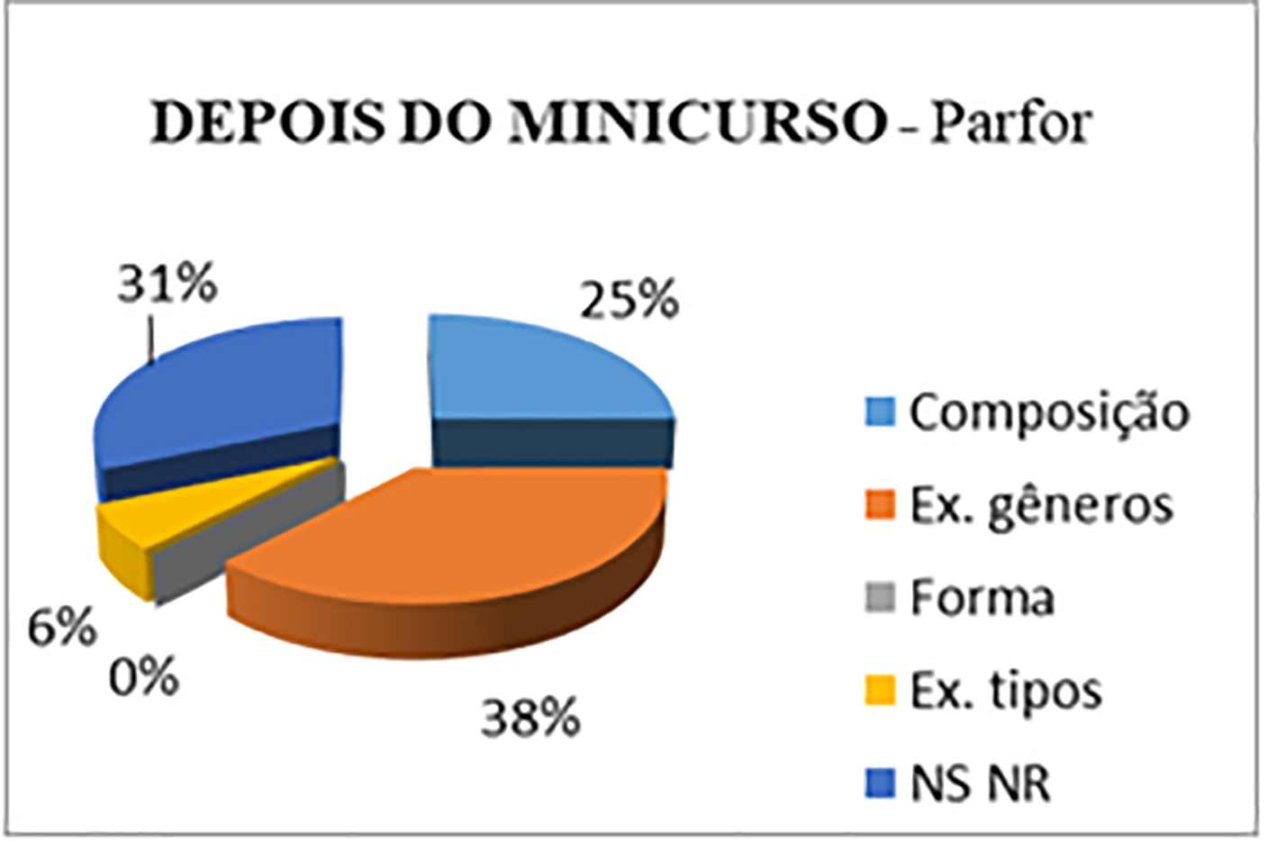 Antes do minicurso, 21% dos licenciandos de Pedagogia utilizaram o conceito de gêneros textuais para responder à questão, enquanto nenhum licenciando do PARFOR respondeu utilizando o conceito. Porém, os licenciandos que responderam a mesma questão exemplificando os gêneros textuais foram de 9% nas turmas de Pedagogia e 19% nas turmas do PARFOR. A partir desses dados, pressupomos que há falta de conhecimento dos termos técnicos, mas em contrapartida, existe o conhecimento prático sobre o tema.