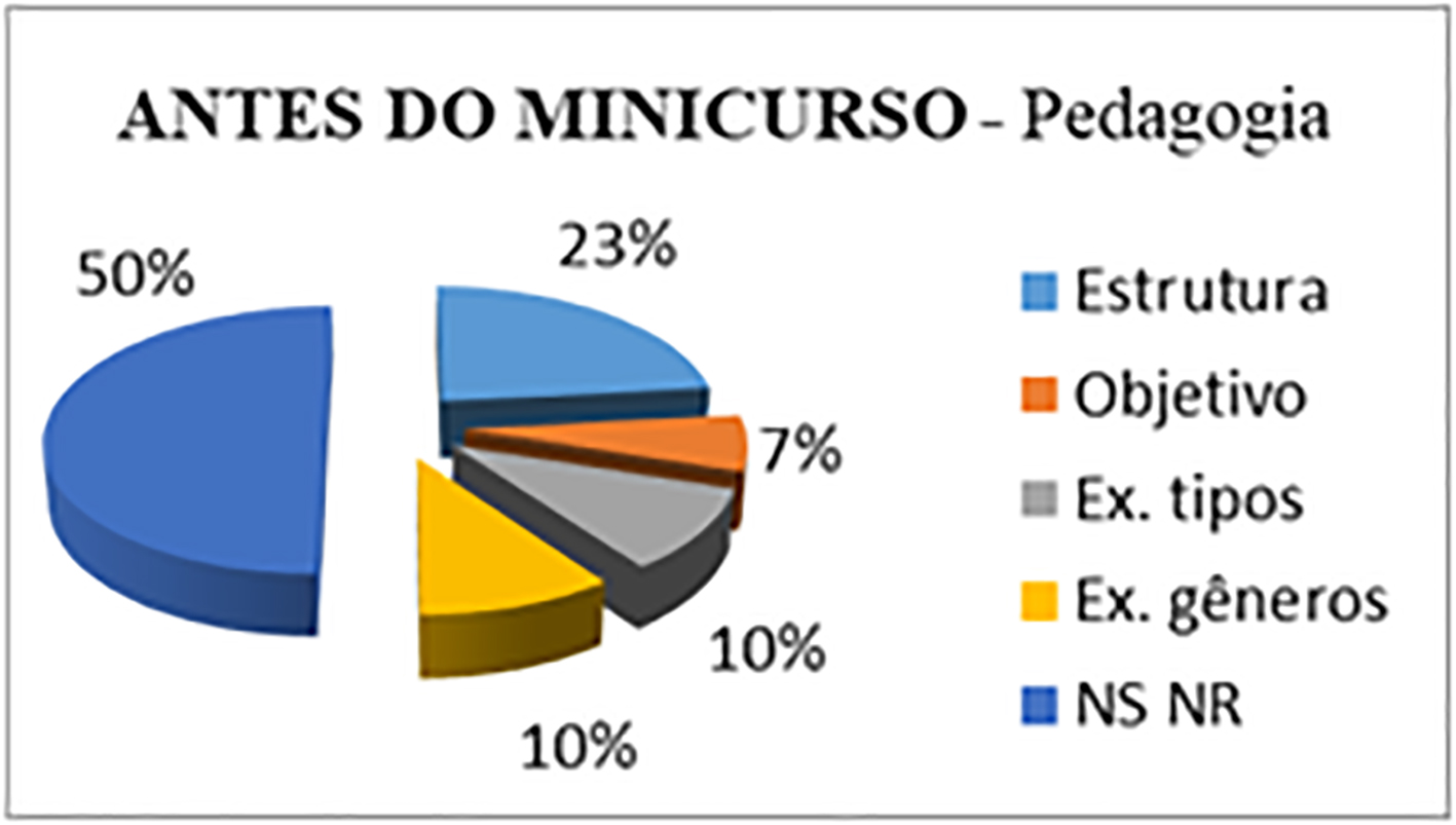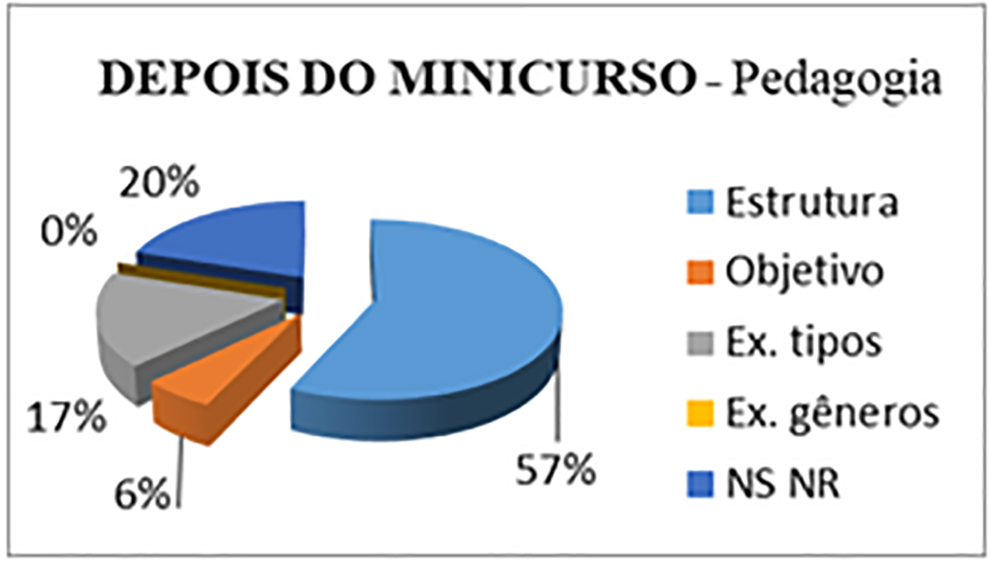 No curso de Pedagogia, antes do minicurso, 65% dos licenciandos exemplificaram corretamente os gêneros textuais, 15% deles classificaram os tipos como gêneros textuais e 20% não souberam ou não responderam. Depois do minicurso, o número de exemplificações corretas em relação aos gêneros textuais subiu de 65% para 88%. O número de classificações de tipos como gêneros textuais caiu de 15% para 9%, e o número de licenciandos que não souberam ou não responderam caiu de 20% para apenas 3%.