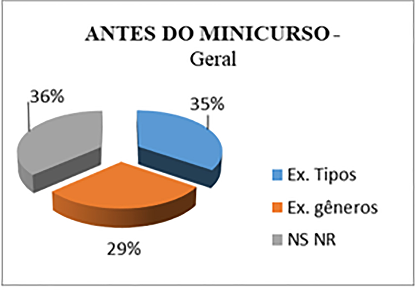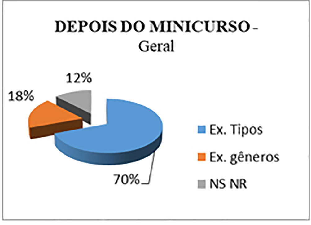Antes do minicurso apenas 52% dos licenciandos exemplificaram corretamente os gêneros textuais, 10% deles classificaram os tipos como gêneros textuais e 38% não souberam ou não responderam. Depois do minicurso, houve uma mudança significativa nesses dados. O número de exemplificações corretas em relação aos gêneros textuais subiu de 52% para 88%. O número de classificações de tipos como gêneros textuais caiu de 10% para 8%.