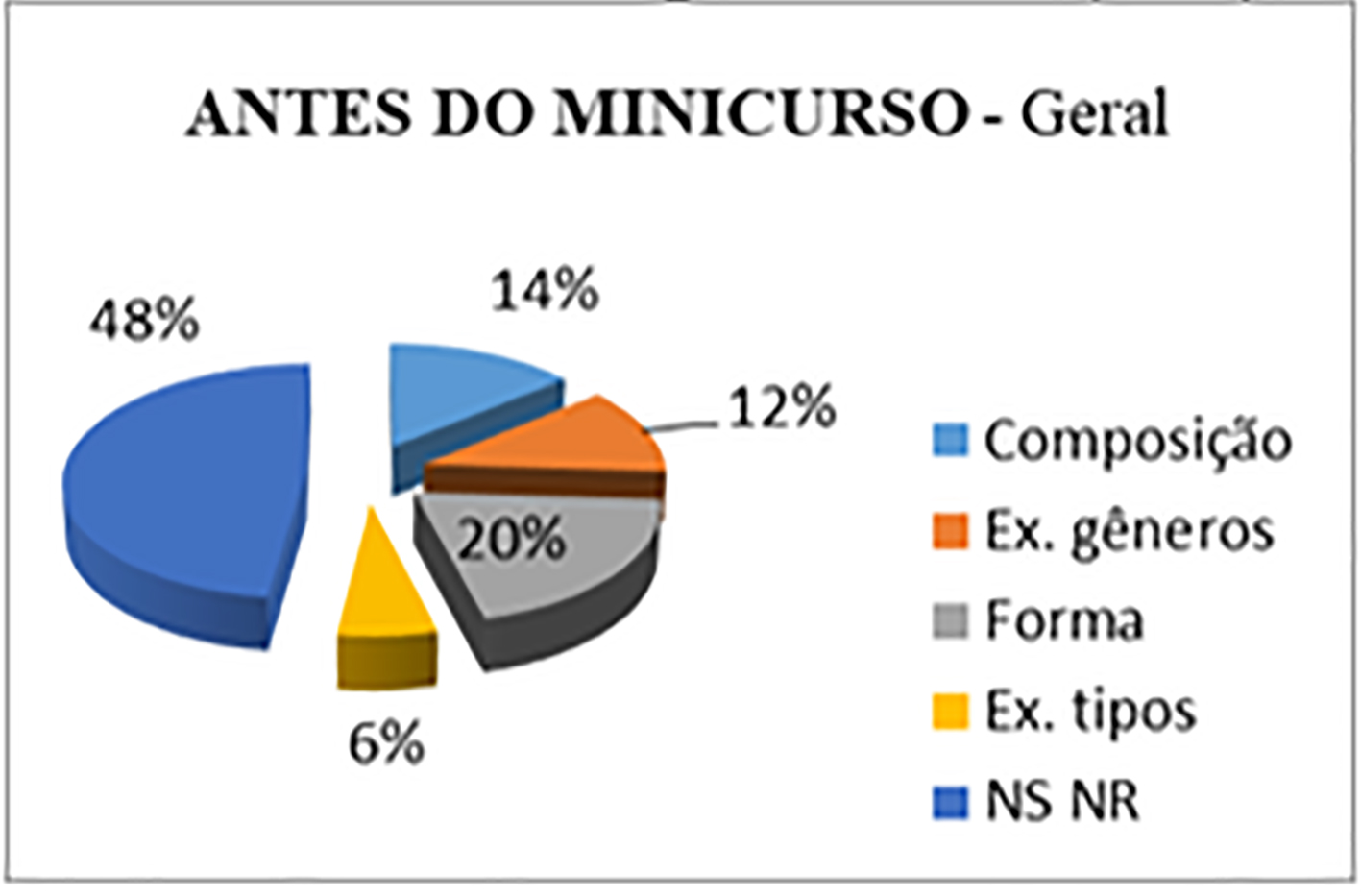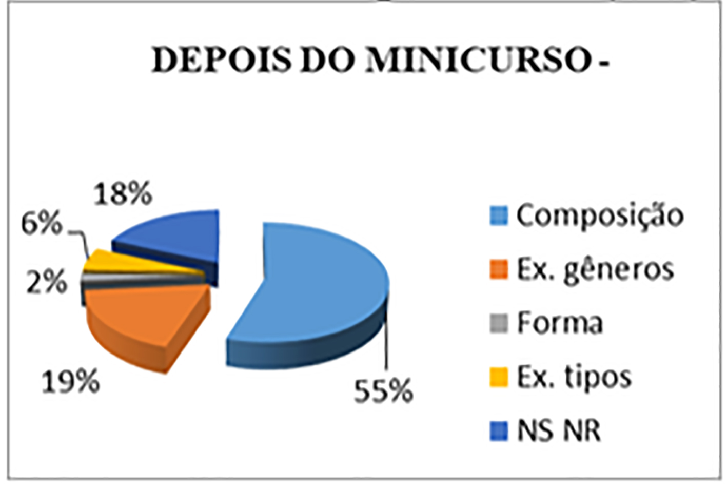 Em relação ao conhecimento sobre gêneros textuais, no que se refere aos dados coletados antes de o minicurso ser ministrado, se somarmos o número de respostas relativas ao conceito (14%) e aos exemplos (12%), apenas 26% dos participantes tinham algum conhecimento sobre o que são os gêneros textuais. Contudo, ao realizarmos a mesma operação com os dados colhidos depois de o minicurso ser aplicado a soma desse mesmo número subiu de 26% para 74%. Ou seja, pode-se afirmar que houve aquisição de conhecimento sobre o tema.