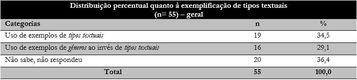 Em relação à exemplificação de tipos textuais, os critérios de categorização ficaram divididos conforme apresentado na Tabela 3.