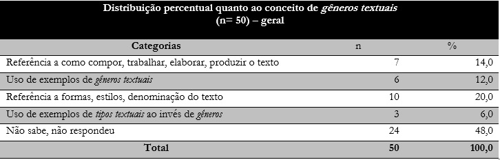 Quando passamos ao conceito de gêneros textuais, o diagnóstico sobre o conhecimento do tema fica muito parecido com o de tipos textuais. O Quadro 5 apresenta um paralelo da categorização conceitual das respostas, apontando a aproximação semântica entre elas. Em relação à conceituação de gêneros textuais os critérios de categorização se dividiram conforme o Tabela 4.