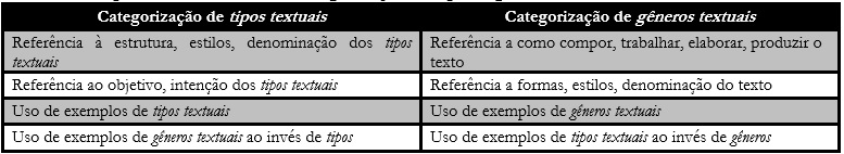 Ao analisar a categorização feita pelos licenciandos, observamos que houve uma proximidade semântica em relação às duas conceituações dos tipos . gêneros textuais, conforme o comparativo no Quadro 2. Isso demonstra e confirma que a falta de explicitação e consistência conceitual gera inconsistência no conhecimento e no uso dos tipos . gêneros textuais.