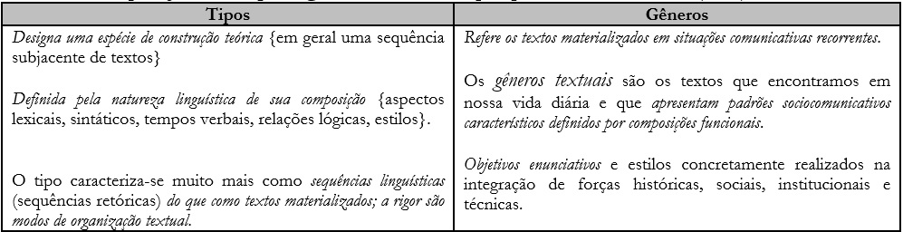 De acordo com Marcuschi (2008), quando se trata de gênero (orais ou escritos), o mais importante é a função social que cada um exerce e não apenas a forma, já que eles são definidos por sua composição, estilo e, principalmente, por seus propósitos comunicativos. Os gêneros textuais, de certa forma, traduzem as várias formas de interlocução entre indivíduos de comunidades diferentes, mas que vivem numa mesma sociedade. Porém, ao fazer um paralelo entre as definições, encontra-se uma linha tênue entre esses conceitos – tipo e gênero –, que não são de fácil interpretação para um leitor com pouco conhecimento do assunto. A partir dessa comparação, pode-se perceber que o autor define os conteúdos de uma forma semanticamente muito próxima.