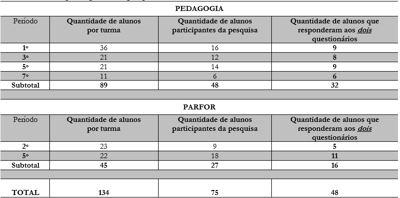 Os sujeitos participantes da pesquisa são alunos de diferentes períodos do curso de licenciatura em Pedagogia da UENF e todos foram convidados a participar da pesquisa, porém, conforme demonstrado na Tabela 1, nem todos optaram pela participação. Ressalta-se que todos os procedimentos adequados para atender às normas de ética de pesquisa, como assinatura do termo de consentimento, foram cumpridos.