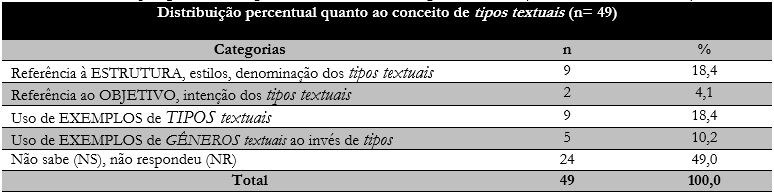 Na primeira questão, foi solicitado aos alunos que definissem com suas palavras o que entendiam por tipos textuais. Em relação ao conceito de tipos textuais, os critérios de categorização se dividiram conforme apresentado na Tabela 2.
