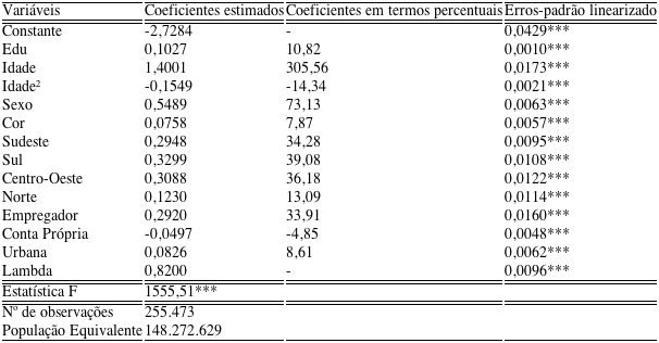 As estimativas dos coeficientes da equação de rendimentos para o Brasil podem ser vistas na Tabela 2.