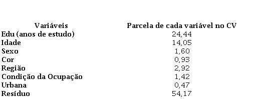 Os resultados da decomposição de Fields podem ser vistos na Tabela 3. Conforme destacado anteriormente, essa decomposição possibilita mensurar a contribuição de cada variável explicativa da equação de rendimentos sobre a desigualdade, mensurada pelo coeficiente de variação.