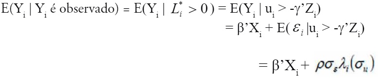 (8)em que Xi é um vetor de variáveis explicativas; é um vetor de parâmetros a ser estimado; e εi é o termo de erro aleatório. Note que Yi é observado somente quando L*i > 0. Por pressuposição, assume-se que ui e εi possuem distribuição normal bivariada com média zero, desvios-padrão σu e σε, e correlação ρ. Dado isso e tomando a esperança (condicionada) de ambos os lados de (8), tem-se: