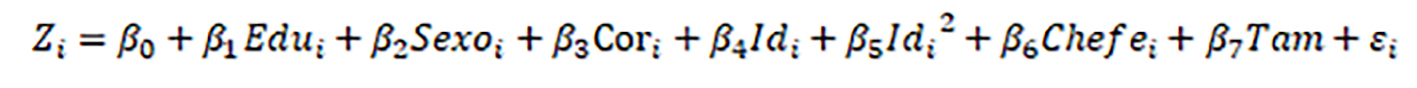 (10)em que Zi é uma variável binária, que reflete a condição de atividade do i-ésimo indivíduo, isto é, 1 se faz parte da força de trabalho e 0, caso contrário; Edu é a escolaridade, em anos de estudo; Sexo é a variável binária para gênero, que assume valor 1 para homens e 0 para mulheres; Cor é a variável binária que assume valor 1 para indivíduos da cor branca e 0, em caso contrário; e as variáveis id e id ao quadrado são, respectivamente, idade e idade ao quadrado, medidas em dezenas de anos; Chefe é a variável binária para a pessoa de referência no domicílio, que assume valor 1 para indivíduos que são chefes de família e 0, em caso contrário; e Tam é o tamanho da família, isto é, o número de membros na família.