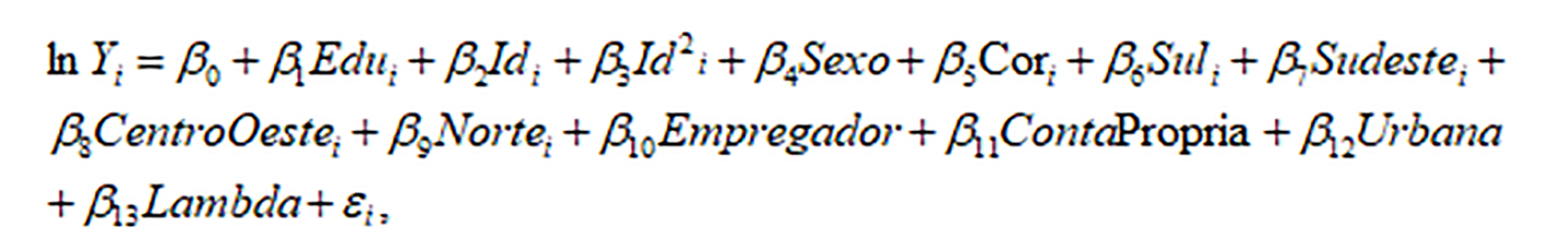 (11)em que lnYié logaritmo natural do rendimento de todos os trabalhos do indivíduo i sobre o número de horas mensais trabalhadas; as variáveis dummies Sul, Sudeste-Norte e Centro-Oeste indicam a região do trabalhador, sendo a categoria-base formada pelos indivíduos da região Nordeste; as variáveis dummies Empregador e Conta Própria indicam a posição na ocupação, em que Empregado é a categoria base; Urbana é uma variável dummy que assume valor 1 se o indivíduo é da zona urbana e 0, caso contrário; as demais variáveis já foram especificadas.
