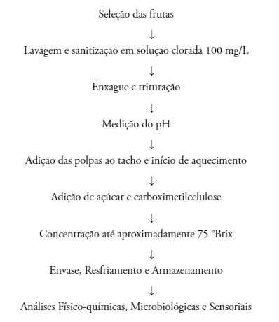 Para elaboração do doce, inicialmente foi realizada a medição do pH das polpas obtidas, estando ele próximo a 3,2, o que é ideal para geleificação (CETEC, 1985). As polpas de jabuticaba, maçã e o albedo de melancia foram transferidos para tacho aberto nos percentuais de 60 %, 30 % e 10 %, respectivamente, e adicionados de 40 % de açúcar cristal juntamente com 0,2 % de carboximetilcelulose, sendo a mistura concentrada até a obtenção de um produto com aproximadamente 75 °Brix a uma temperatura de mais ou menos 108 °C. Posteriormente, o doce ainda quente foi transferido para potes de vidro com tampa de metal, sendo o processamento realizado conforme a Figura 1 e as análises realizadas em três repetições.