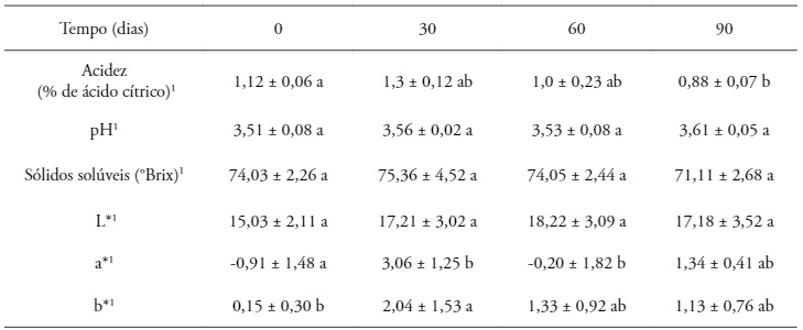 A determinação de acidez titulável em % de ácido cítrico e de pH (Tecnopon, modelo 210) foi realizada logo após o processamento (tempo 0 horas) e 30, 60 e 90 dias após armazenamento à temperatura ambiente, segundo a AOAC (2010).