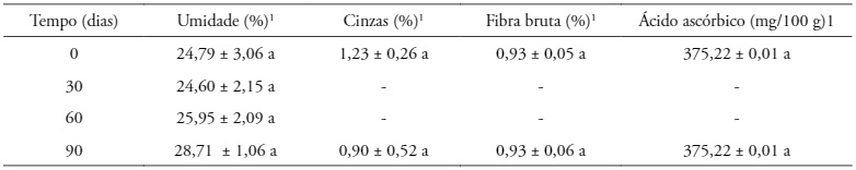 A umidade não sofreu influência significativa do tempo (p>0,05) (Tabela 2). Os valores de umidade apresentaram-se próximos aos observados por Dias et al. (2011) para doce em massa de casca de maracujá (26,01 %) e por Freda (2014) para doce em massa de goiaba (25,00 %). Já o teor de cinzas do doce avaliado logo após o processamento (tempo 0 horas) e 90 dias após de armazenamento, também não apresentou diferença estatística (p>0,05), sendo os valores obtidos neste estudo superiores ao verificado por Alves et al. (2015), que obtiveram valor de 0,70 % para doce em massa de banana (Tabela 2).