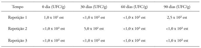 A contagem padrão em placas de fungos filamentosos e leveduras foi realizada após o processamento (tempo 0) e 30, 60 e 90 dias após armazenamento do doce. Essa contagem foi realizada em Ágar Dicloran Rosa de Bengala Cloranfenicol (DRBC), conforme descrito por Beuchat e Cousin (2001). As placas foram incubadas em posição normal a 25 °C por 5 dias para realização da contagem, a fim de verificar se o produto atendia ao padrão de qualidade microbiológica estabelecido pela legislação vigente (BRASIL, 2001).