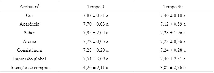 Para a realização do teste de aceitação, os julgadores avaliaram as amostras utilizando escala hedônica de nove pontos, variando de “gostei extremamente” a “desgostei extremamente”, para os atributos cor, sabor, aroma, aparência, consistência e impressão global. Para a intenção de compra, aplicou-se a escala estruturada de cinco pontos variando de “certamente não compraria” a “certamente compraria” (MINIM, 2006). As análises foram realizadas logo após a fabricação do doce (tempo 0) e após 90 dias de fabricação.