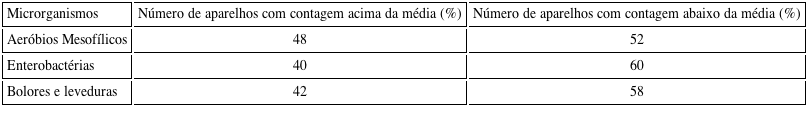 Bactérias coliformes totais estavam presentes em 50% dos aparelhos analisados neste estudo. Este grupo de bactérias engloba gêneros como Escherichia, Citrobacter, Enterobacter e Klebisiela (BETTEGA et al., 2006).