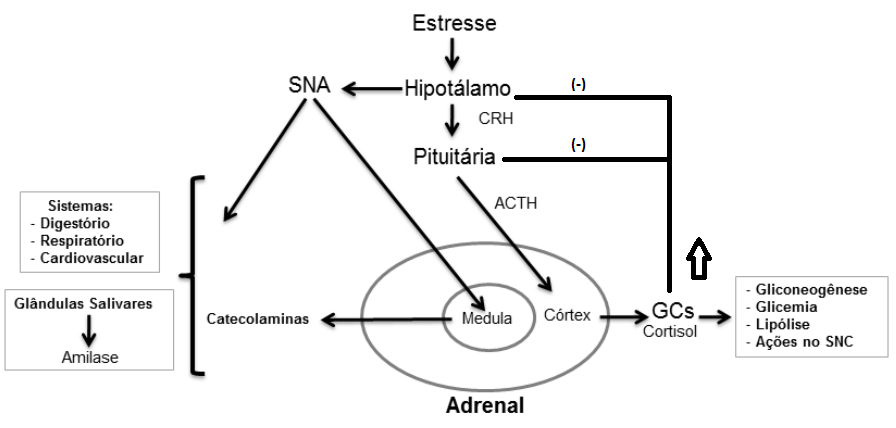 As percepções de dor causadas pelo estresse físico ou lesões nos tecidos são, inicialmente, transmitidas centralmente por meio do tronco cerebral para a eminência mediana do hipotálamo, onde o CRH é liberado para o sistema porta-hipofisário. Rapidamente, toda a sequência de controle provoca a liberação de grande quantidade de cortisol no sangue. O estresse psicológico pode ocasionar elevação igualmente rápida da secreção de ACTH. Aceita-se que isso resulte do aumento no funcionamento do sistema límbico, particularmente na região da amígdala e do hipocampo, que transmitem, então, estímulos para o hipotálamo. A Figura 2 mostra que o próprio cortisol atua negativamente (feedback negativo) sobre o hipotálamo e a pituitária para manter o seu ponto de equilíbrio. Contudo, estudos demonstraram que os estímulos estressantes são preponderantes. Dessa forma, o estresse pode se impor sobre o feedback inibitório direto do cortisol, provocando exacerbações na secreção do cortisol (GUYTON; HALL, 2011).