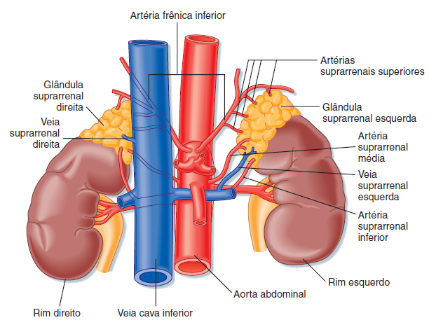 As glândulas adrenais compreendem duas regiões distintas: uma parte interna, ou medula, que secreta adrenalina (epinefrina) e noradrenalina (norepinefrina), e uma camada externa, ou córtex, que é subdividida em três camadas: zona glomerulosa, que secreta o mineralocorticoide aldosterona; zona fasciculada que produz, principalmente, o glicocorticoide cortisol e zona reticular produtora de hormônios androgênicos (BEAR; CONNORS; PARADISO, 2017; OLIVEIRA, 2013).