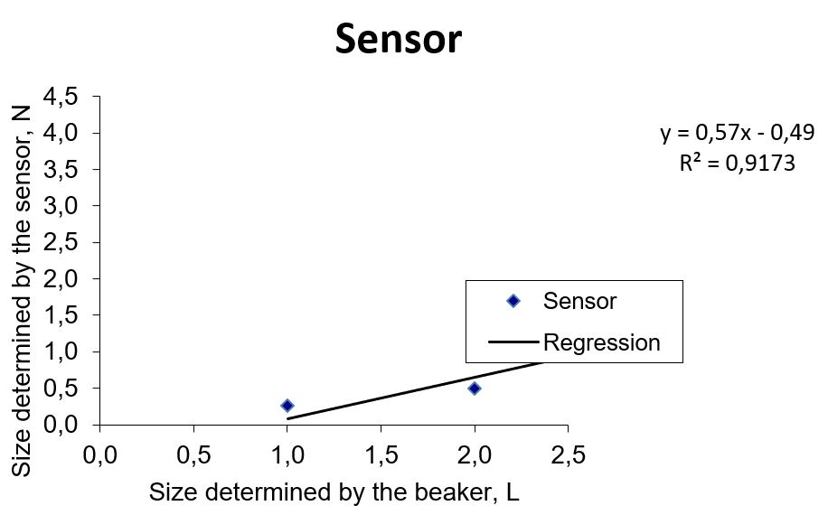 The sensor was evaluated using volume measurement previously determined from water, of 250, 500, 1,000 and 2,000 mL, at 20 °C. A graduated measuring beaker was used to determine the volume, with a 250 mL capacity, ± 2 mL.