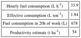 The effective consumption, which refers to fuel volume used per ton of harvested sugar cane was estimated in 1.84 L t-1 (Table 4). According to Istoé Dinheiro Rural (REFORÇO…, 2009), the effective consumption from harvester A4000 is 0.84 L t-1. The value obtained in this research was higher than the ideal value estimated by the company that manufactured this machine.