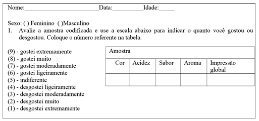 Aplicou-se teste de aceitação, por meio da escala hedônica de 9 pontos, avaliando-se os seguintes atributos: cor, aparência, sabor, textura e impressão global, conforme Minim (2013).