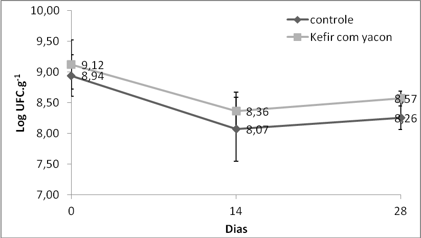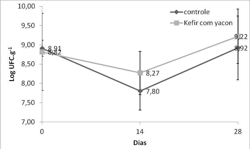 A contagem de bactérias láticas em ágar MRS variou de 7,80 a 8,92 Log UFC.g-1 no kefir controle e de 8,27 a 9,22 Log UFC.g-1 no kefir adicionado de yacon (Figura 2). A contagem de cocos Gram positivos em ágar M17 variou de 8,07 a 8,94 UFC.g-1 no kefir controle e de 8,36 a 9,12 Log UFC.g-1 no kefir adicionado de yacon (Figura 3). Os resultados mostram que a contagem de lactobacilos e cocos Gram positivo nas duas amostras é semelhante (p>0,05), não se podendo afirmar que o yacon atua como prebiótico para as bactérias láticas presentes no kefir. Provavelmente o decréscimo na contagem das bactérias láticas até os 14 dias se deve a adaptação do microrganismo no meio, com posterior crescimento a partir desse tempo.