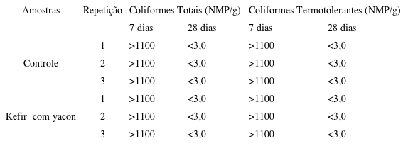Na elaboração de iogurte de mirtilo adicionado de kefir com reduzido teor de lactose, Pietta e Palezi (2015) não encontraram coliformes termotolerantes nas amostras avaliadas, semelhante ao resultado após 28 dias de armazenamento do presente estudo no fim da vida de prateleira.