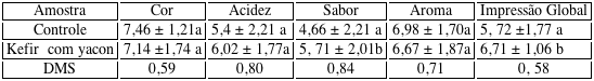 Os escores médios atribuídos aos produtos variaram entre, 5,40 a 7,46 (Tabela 2). Percebe-se que os produtos tiveram aceitação em relação à cor e aroma, e para kefir com yacon aceitação no parâmetro acidez e impressão global.