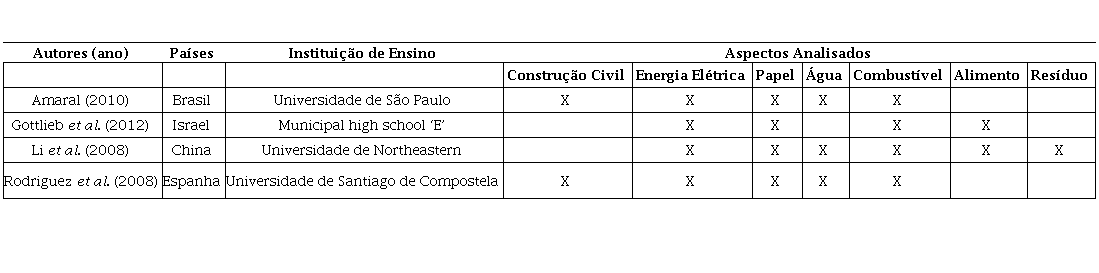 Nos últimos dez anos, em Instituições de Ensino (IE) de países como Israel, China, Espanha e inclusive Brasil (pela Universidade de São Paulo - USP), foram realizados trabalhos sobre PE, cujos principais aspectos analisados foram construção civil, energia elétrica, papel, água, combustível, alimento e resíduos (Tabela 1) (GOTTLIEB et al., 2012; LI et al., 2008; RODRIGUEZ et al., 2008; AMARAL, 2010). Percebe-se, no entanto, que essa é uma temática ainda pouco explorada no ambiente das IE, o que motivou a realização desta pesquisa. Outro aspecto, além disso, consiste no fato de a IE onde o estudo de caso foi realizado (IFFluminense) ser pública e de, por esse motivo, ter a obrigação de direcionar esforços em prol da sustentabilidade socioambiental em suas atividades.