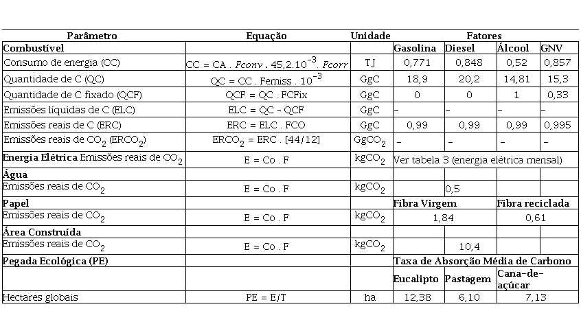 De acordo com Rodríguez et al. (2008), para o cálculo das emissões de CO2 ocasionadas pelo consumo de energia elétrica, água, papel e área construída, deve-se multiplicar o valor total consumido no período analisado pelo fator de emissão, conforme apresentado na Tabela 2. Mais detalhes sobre a metodologia empregada podem ser obtidos no trabalho de Silva (2015).