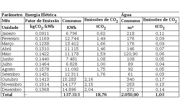 A Tabela 3 apresenta os valores de fator de emissão, consumo e de emissão de CO2 referentes aos itens energia elétrica e água. Analisando-a, é possível observar que os meses de outubro, novembro e dezembro são os de maior emissão de CO2 em função do consumo elevado e devido ao fator mais alto. Por outro lado, os meses de janeiro e julho possuem menor consumo e, consequentemente, menores emissões; além disso, em janeiro o fator de emissão é reduzido, pois a matriz energética nesse mês, devido ao período de chuvas, tem maior participação da hidroeletricidade.