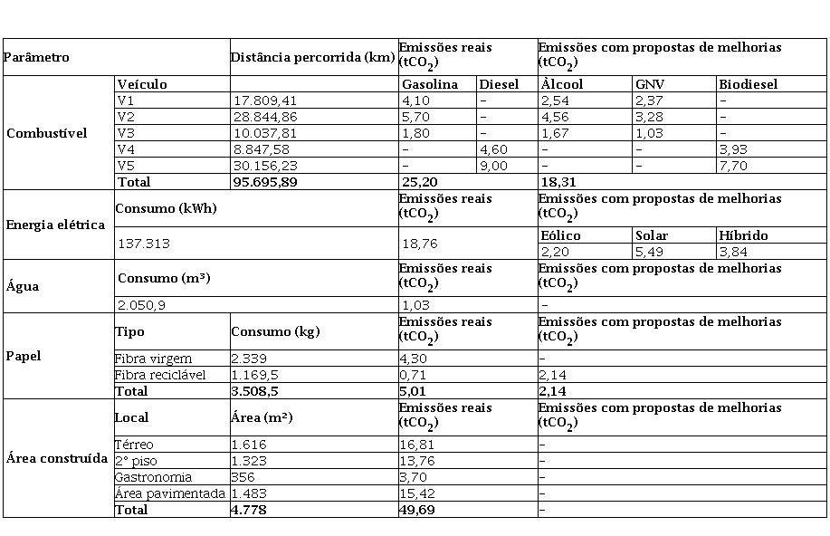 O item que mais colaborou com as emissões de CO2 foi a área construída (49,69 tCO2), seguido do consumo de combustível (25,2 tCO2), enquanto que energia elétrica, água e papel juntos contribuíram com 24,80 tCO2. Com a implantação das propostas de melhorias, as emissões poderiam ser reduzidas em até 24,83 %.