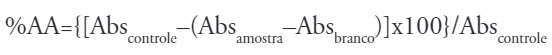Onde: Abscontrole é a absorbância da solução metanólica de DPPH a 40 μg/mL e Absamostra é a absorbância da mistura reacional (DPPH + amostra).
