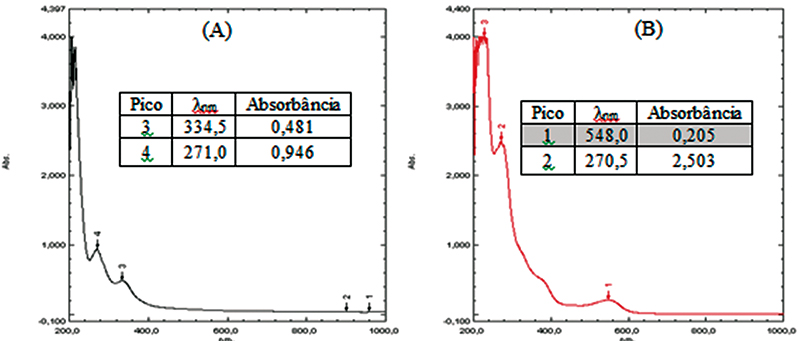 O método da butanólise é citado como o melhor ensaio para determinar a presença de proantocianidinas dada sua alta seletividade (HAGERMAN; BUTLER, 1989). O teste se fundamenta na reação colorimétrica com intensa absorção na região de 550 nm após o tratamento com ácido. Em meio ácido, alcoólico e a quente, as proantocianidinas liberam antocianidinas em razão da quebra das ligações entre as unidades monoméricas. No extrato metanólico antes e após a reação, a leitura das absorbâncias (Figura 3) permitiu observar o aparecimento de uma banda em 548 nm (pico 1), confirmando a presença de antocianidinas (SANTOS; MELLO, 2003).