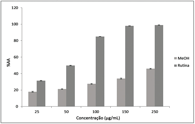 As soluções metanólicas do extrato em metanol e do controle positivo (rutina) foram preparadas nas concentrações de 25,0 μg/mL a 250,0 μg/mL. Como branco utilizou-se a mistura de 2,7 mL de metanol e 0,3 mL da solução do extrato. Os valores de absorbância das misturas reacionais (0,3 mL da amostra + 2,7 mL da solução de DPPH 40,0 μg/mL) em todas as concentrações testadas, após 30 minutos de repouso, foram convertidos em porcentagem de atividade antioxidante (%AA), determinada pela equação: