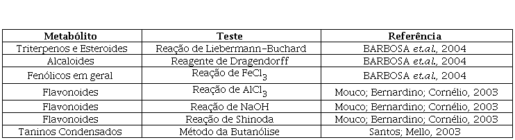 A avaliação fitoquímica é considerada um desafio quando se verifica o crescente interesse por fitoterápicos, sendo papel do pesquisador investigar de maneira cuidadosa espécies com possíveis aplicações terapêuticas (SILVA; MIRANDA; CONCEIÇÃO, 2010). O estudo fitoquímico permite identificar classes de metabólitos presentes em espécies vegetais com possíveis aplicações medicinais (SIMÕES, 2001).