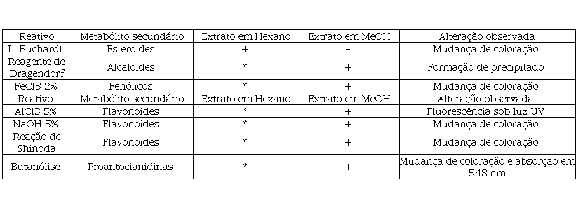 O perfil químico dos extratos brutos (em hexano e metanol) foi avaliado qualitativamente para identificação dos metabólitos secundários (Tabela 1).