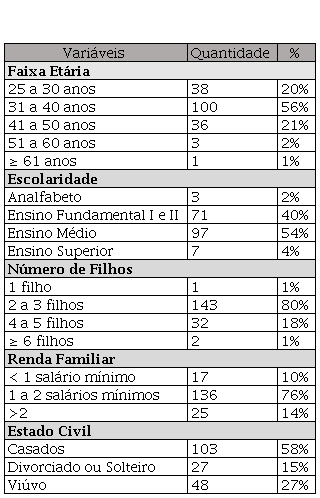 Na Tabela 1, constam os dados obtidos nos prontuários, os quais estão caracterizados pelas variáveis: faixa etária; escolaridade; renda familiar; número de filhos e estado civil.