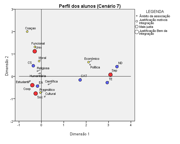 Em resumo, enquanto a dimensão 1 nos mostra a distância relacional do perfil da separação para os outros dois, numa lógica exclusão-inclusão; a dimensão 2 mostra-nos a distância entre o perfil do universalismo e o perfil composto pela socialização e a cooperação, numa lógica de proximidade-distância.