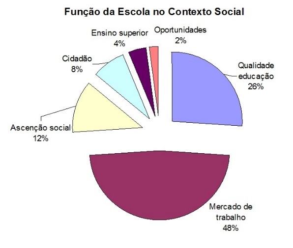 Uma das questões investigadas foi sobre a importância da escola na vida dos alunos. As respostas confirmaram em parte a tese weberiana da racionalização do ensino. A maioria dos alunos (24%) apontaram que a importância da escola está ligada à possibilidade de ela lhe proporcionar acesso ao mercado de trabalho. Em seguida, 17% apontaram para a melhora como pessoa, em termos de agregação de valores sociais e amadurecimento pessoal. Outros 17% afirmaram que a importância está na formação cidadã e, por fim, 15% assinalaram o acesso ao conhecimento.