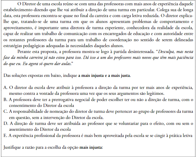 Ora, o objetivo é então o de analisar de que forma os inquiridos se posicionam perante a presente situação hipotética, aventando para tal diferentes possíveis gramáticas para resolver o diferendo – isto é, de que forma o diretor da escola deve lidar com a questão da atribuição do cargo de direção de turma e as objeções apresentadas pela docente.